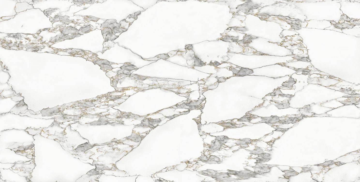 Arabescato is defined by its crisp white base layered with bold, flowing grey veining and subtle warm undertones. The dynamic movement across the slab creates a high-end natural look, making it ideal for feature kitchens, waterfall islands, and statement walls. Its strong visual presence delivers depth and sophistication while maintaining a refined and elegant balance suited to both modern and classic interiors.