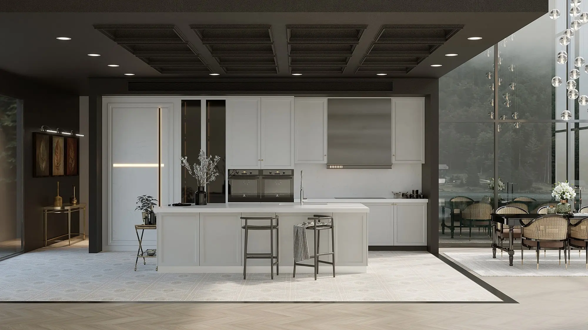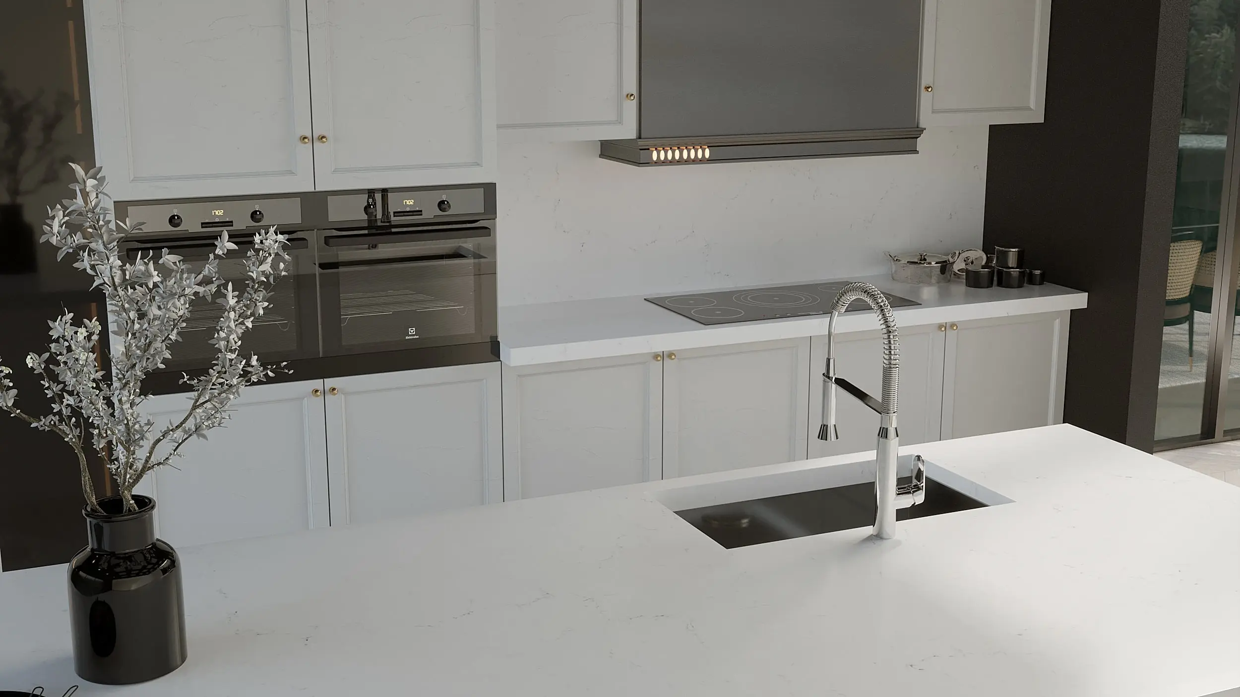 Asteria works seamlessly with modern and classic interiors, pairing well with white cabinetry, timber finishes, and soft neutral palettes. Its polished surface enhances the clarity of the white base while maintaining a smooth and elegant marble-inspired finish, suitable for both residential and commercial projects.