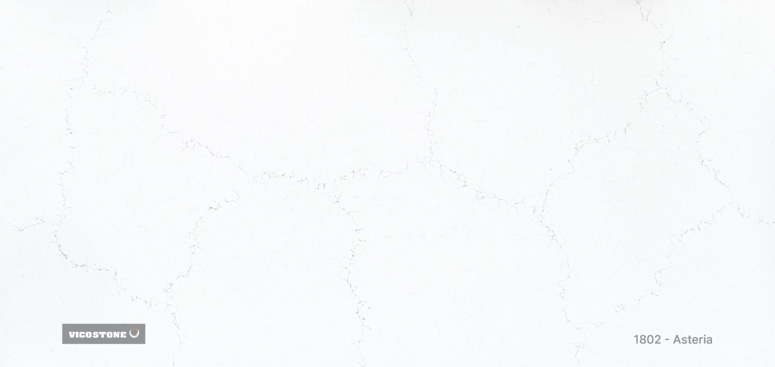 Asteria is a beautifully balanced engineered stone featuring a soft white foundation enhanced by fine, flowing grey veining. Inspired by the gentle movement of mist and drizzle, the pattern creates a light and refreshing surface with subtle visual texture.