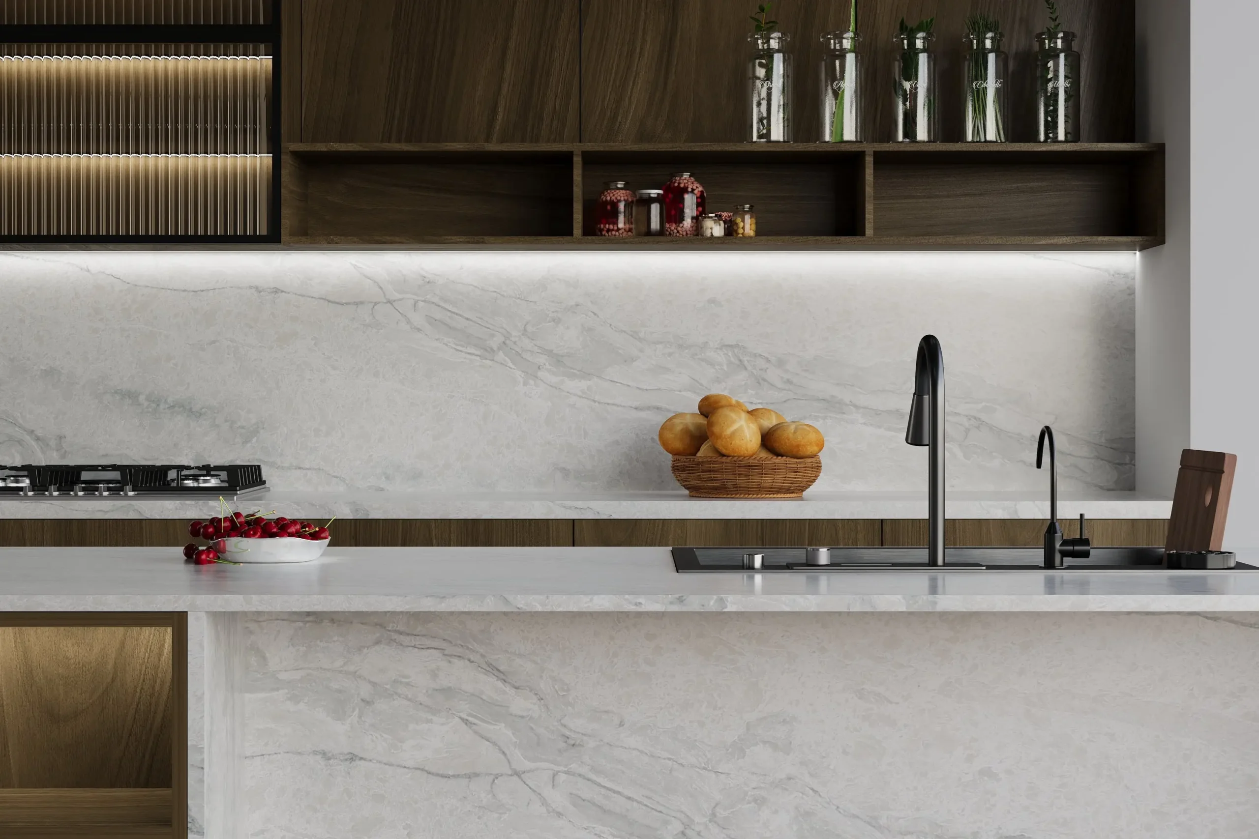 The balanced movement within the slab allows it to stand out while still maintaining a clean and cohesive appearance. It is well suited for kitchen benchtops, waterfall islands, splashbacks, bathroom vanities, and feature walls, bringing a sophisticated finish to both light and dark design palettes.