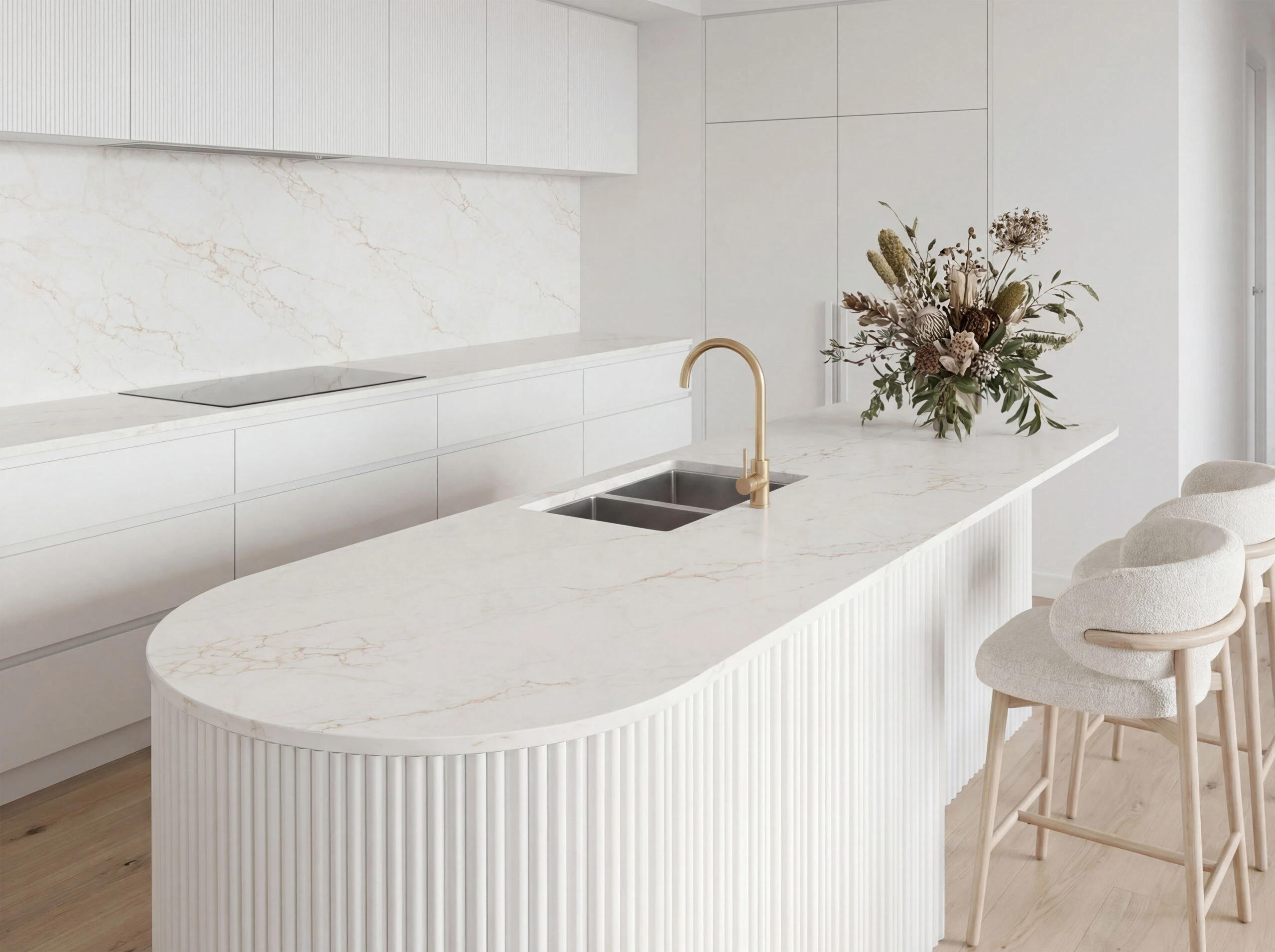 Bernice Gold is a polished mineral surface with a pure white base and soft beige veining. Its gentle warmth and refined movement make it a beautiful choice for kitchen benchtops, waterfall islands, splashbacks, bathroom vanities, and elegant feature surfaces.