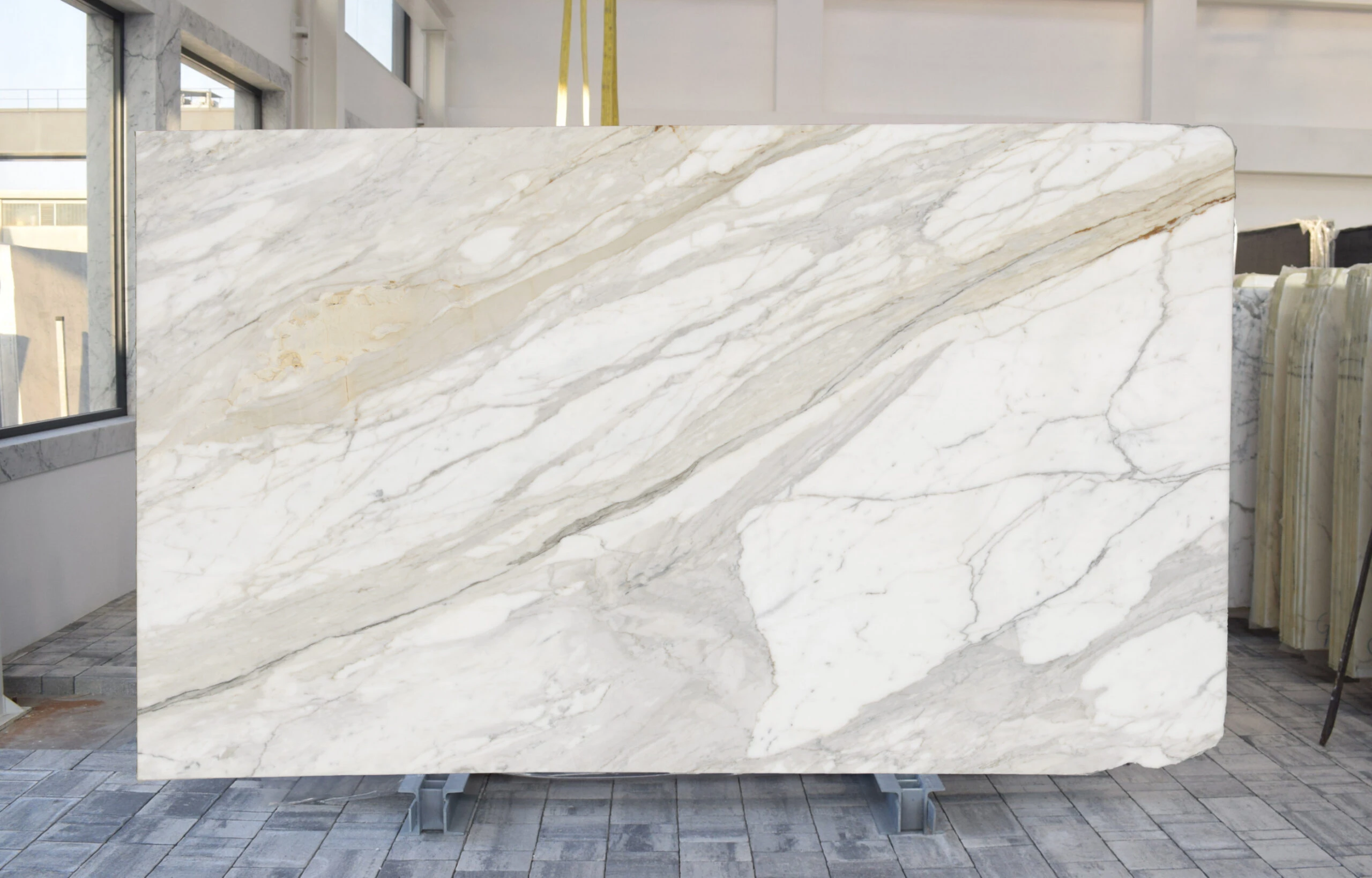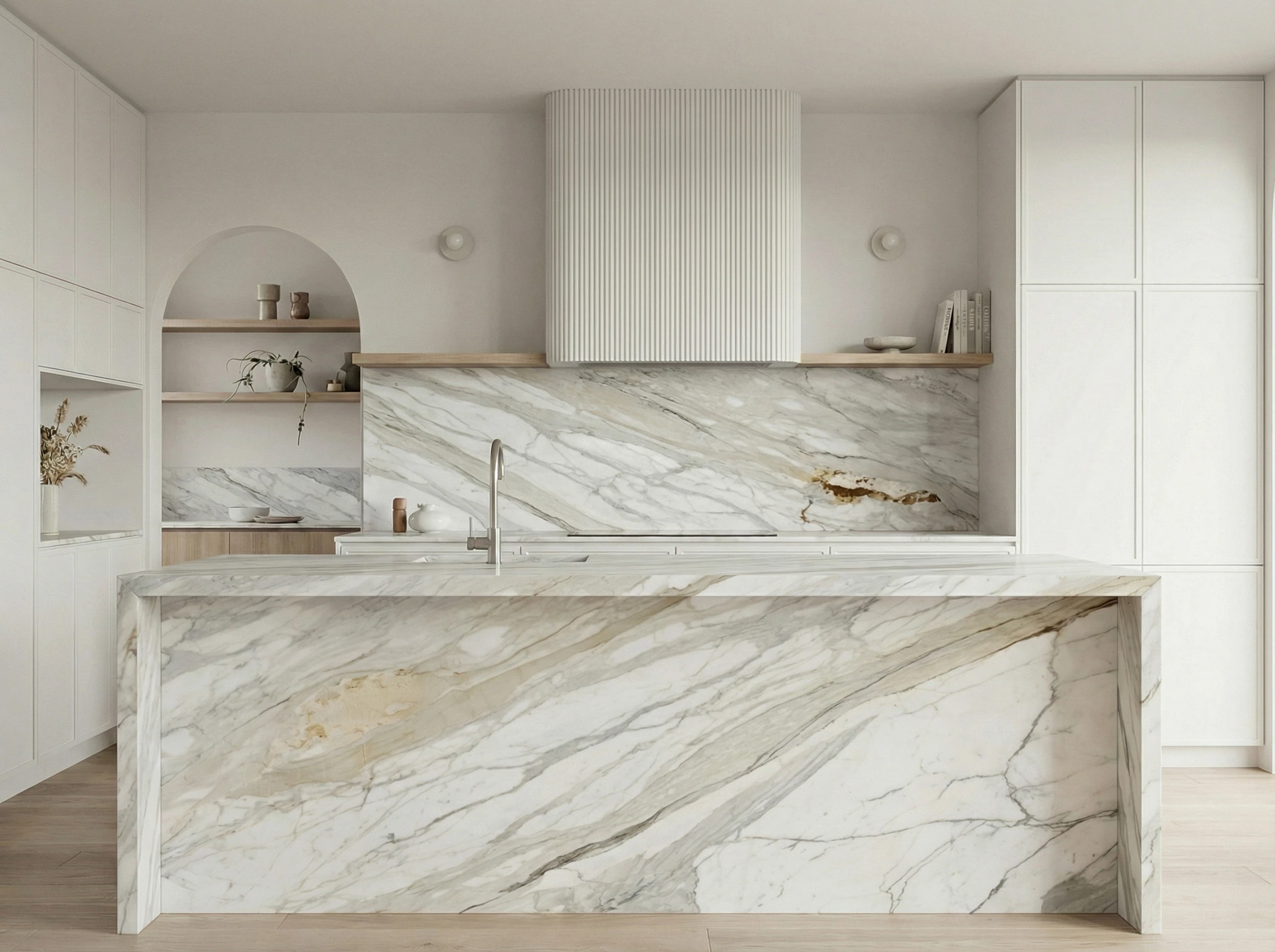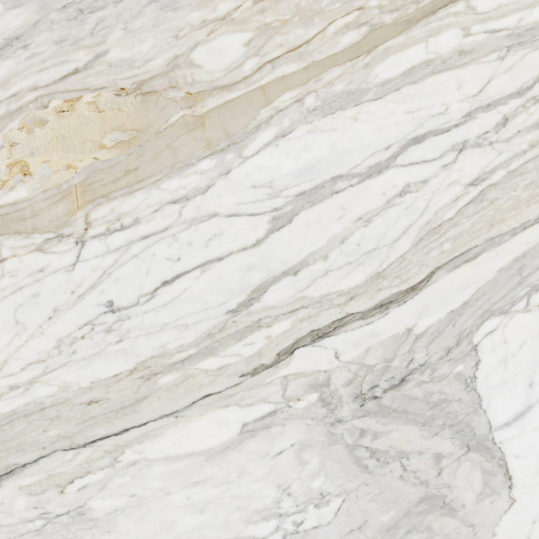 This stone sits at the very top tier of classic marble aesthetics, offering a refined contrast between clean white tones and expressive veining. The addition of soft gold undertones brings warmth into the design, elevating it beyond standard Calacatta looks and making it highly desirable for high-end interiors.