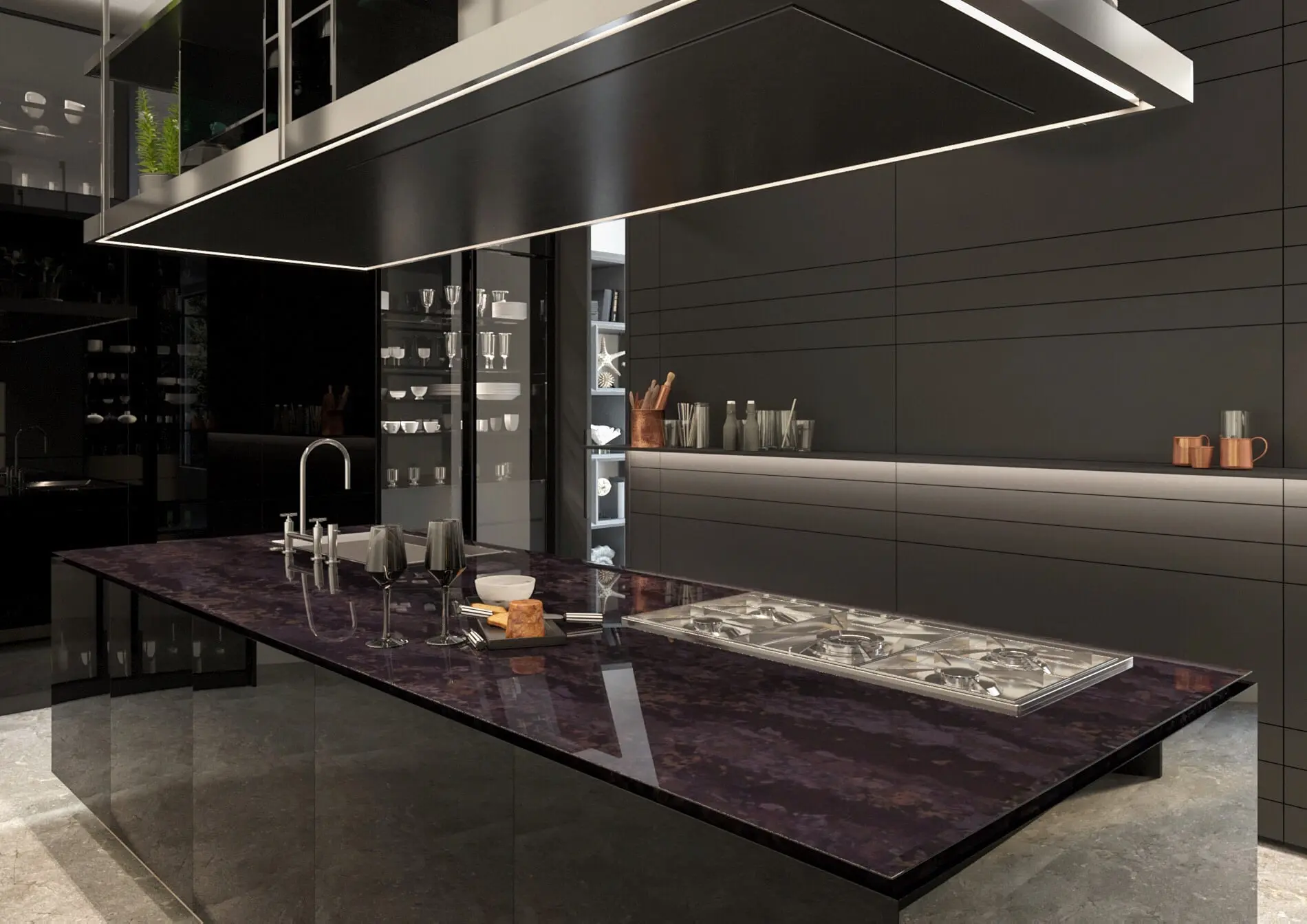 Earthshine is perfectly suited to modern, luxury, and architectural interiors, pairing beautifully with dark cabinetry, metallic finishes, and ambient lighting. Its polished surface enhances the subtle shimmer, adding depth and dimension across the slab.