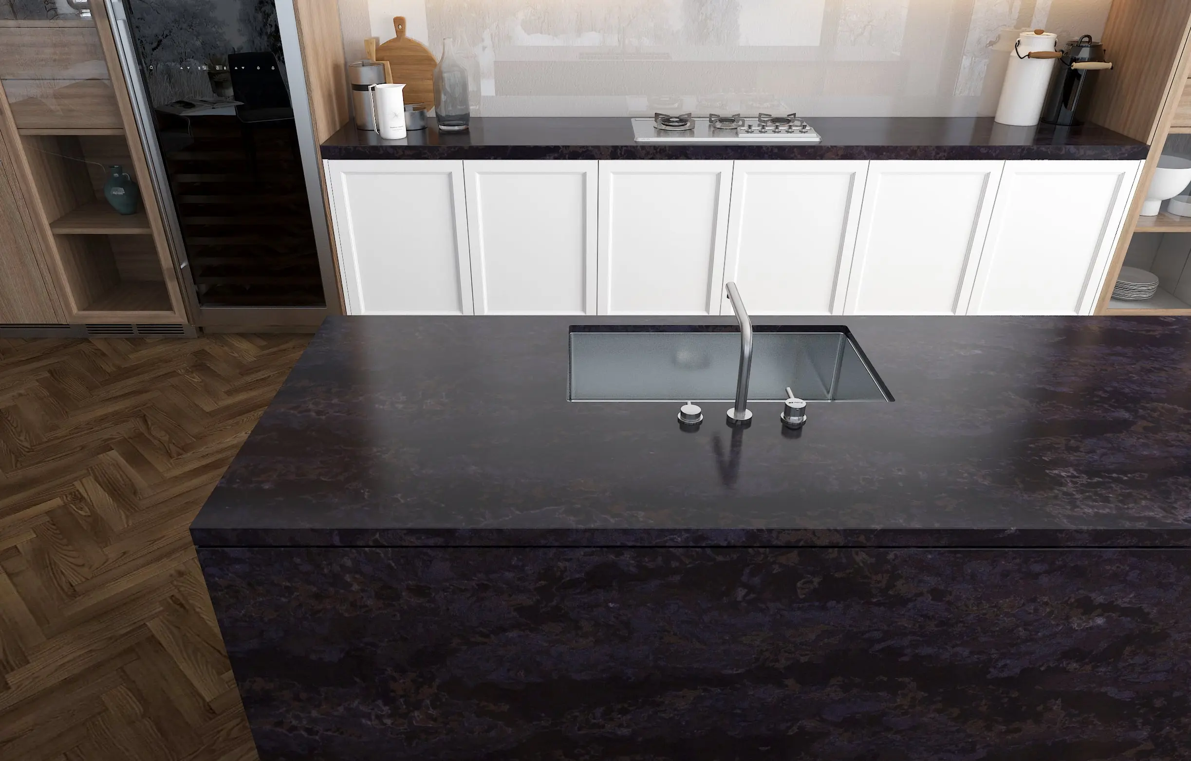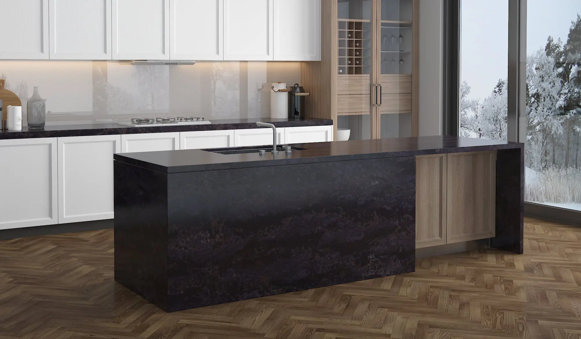 Earthshine is a striking engineered stone inspired by the depth and mystery of a star-filled night sky. Its rich dark base is layered with subtle tonal variations and delicate reflective highlights, creating a textured surface that captures light in a unique and sophisticated way.