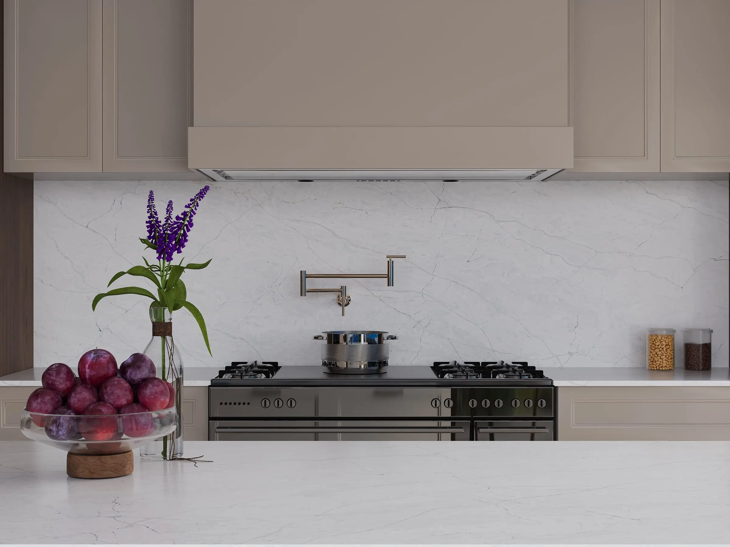 Eirian pairs effortlessly with both modern and classic interiors, working beautifully alongside timber finishes, neutral palettes, and darker cabinetry. The polished finish enhances the natural flow of the veins while maintaining a clean and luxurious appearance.