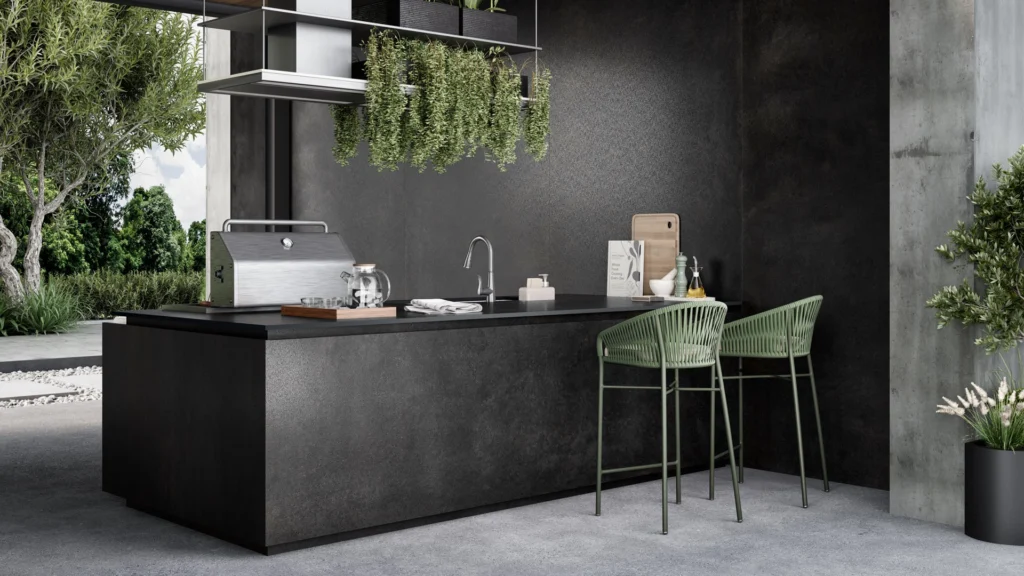 311 Graphite Metal delivers a dramatic industrial look with rich blue-grey and charcoal tones that create the appearance of oxidised weathered steel. Its honed metal-effect finish adds tactile depth and a refined burnished quality, giving the surface a bold architectural presence while still feeling polished and sophisticated. This design pairs beautifully with black cabinetry, warm timber, concrete textures, brushed metals, and minimalist interiors. Suitable for indoor and outdoor applications, 311 Graphite Metal is a powerful option for kitchen benchtops, bathroom vanities, outdoor kitchens, splashbacks, feature walls, and commercial spaces seeking a strong contemporary finish.