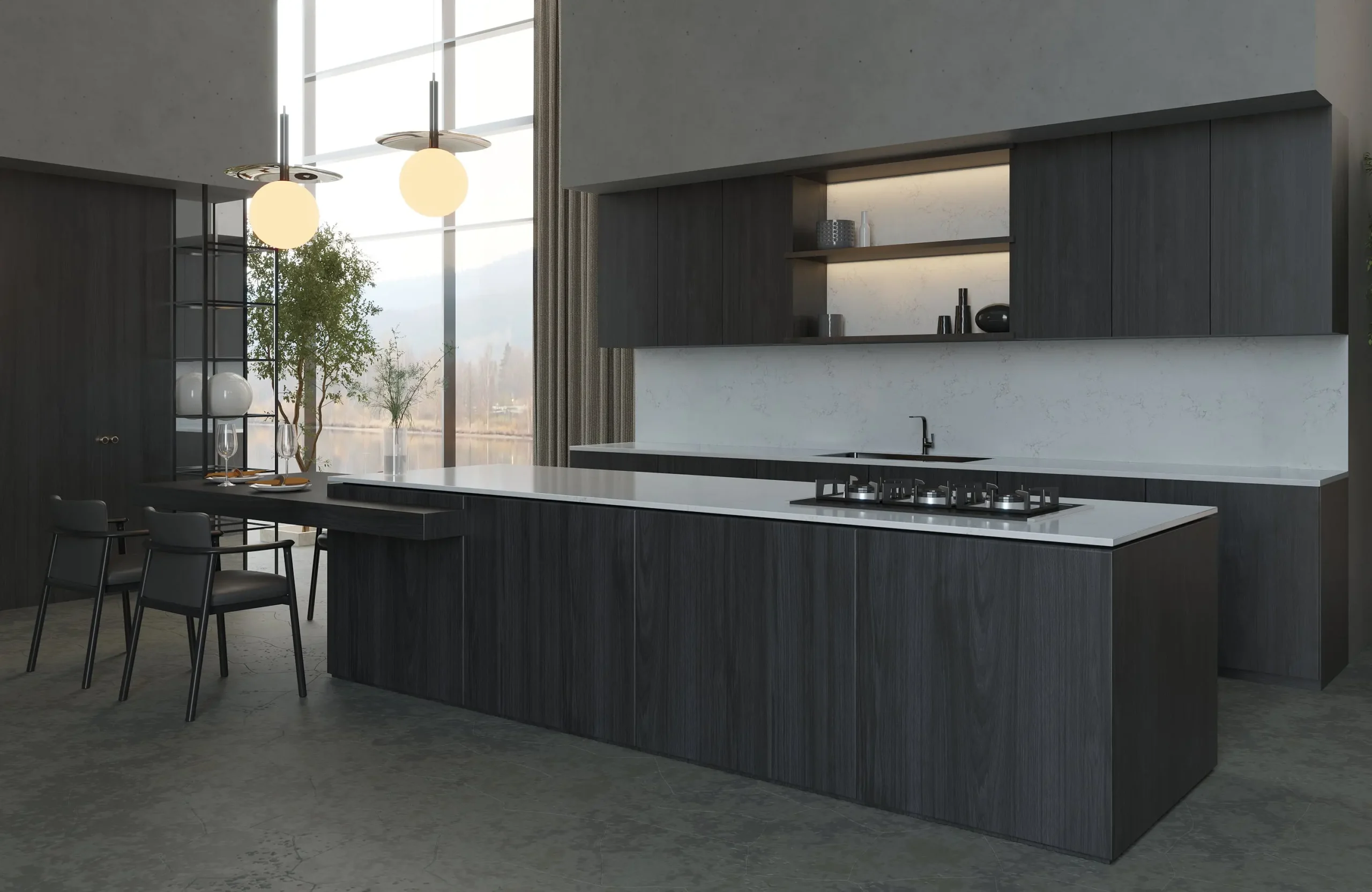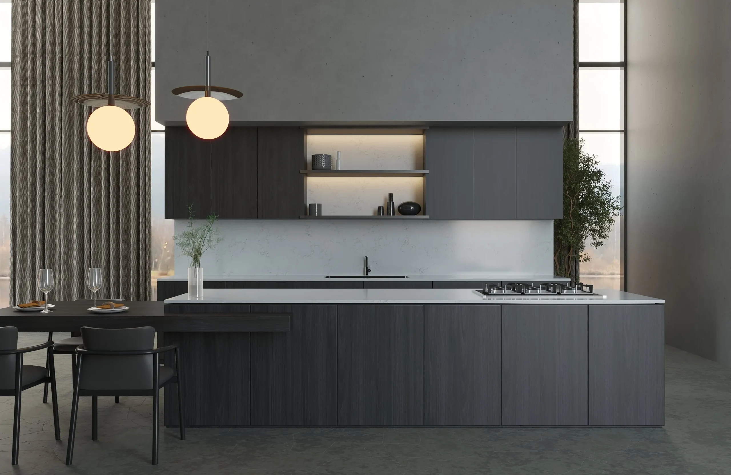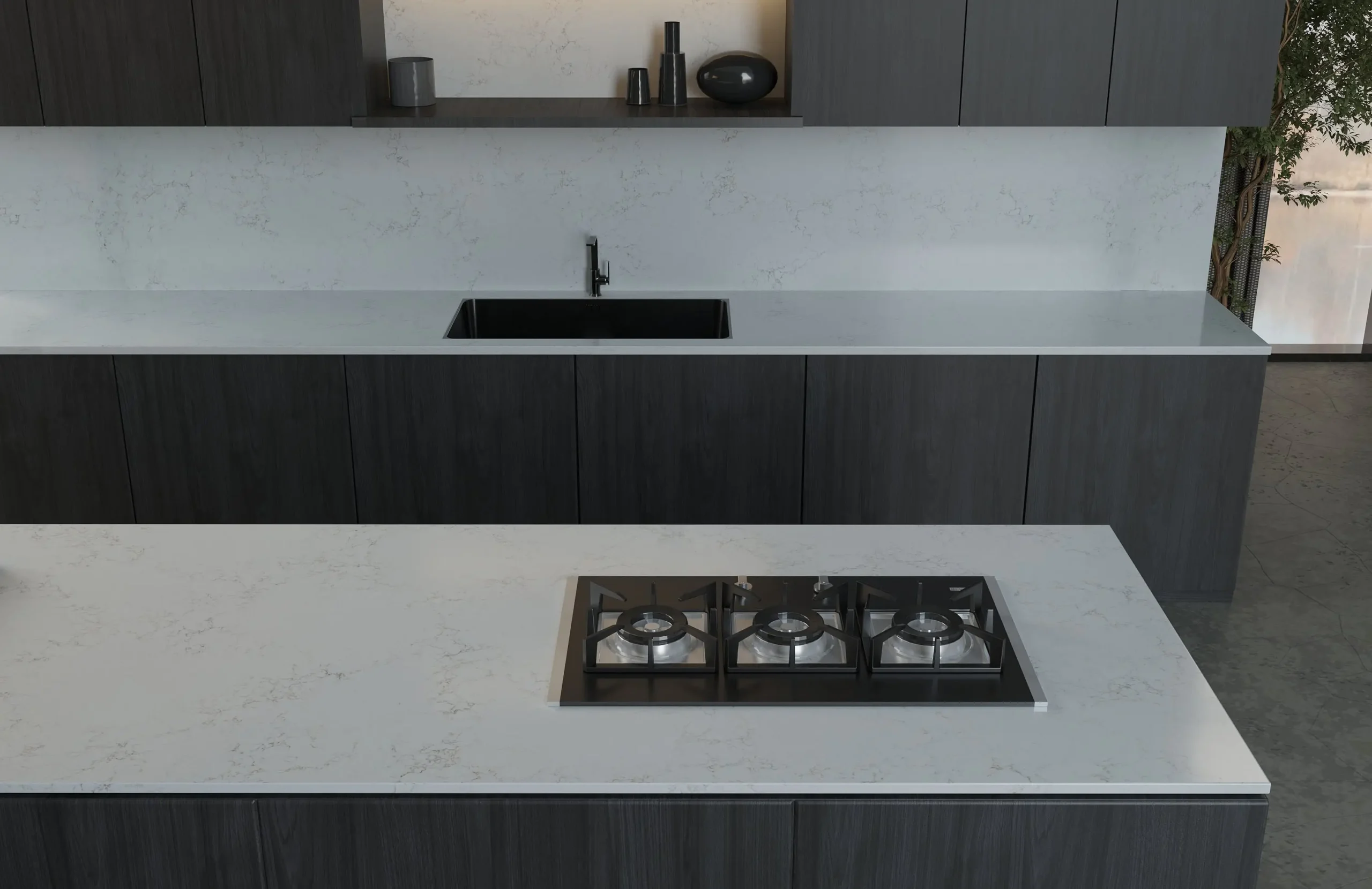 The delicate veining pattern adds movement without overwhelming the design, making it ideal for kitchen benchtops, waterfall islands, splashbacks, bathroom vanities, and feature wall applications. It pairs beautifully with timber finishes, neutral cabinetry, and warm metallic accents such as brushed brass.