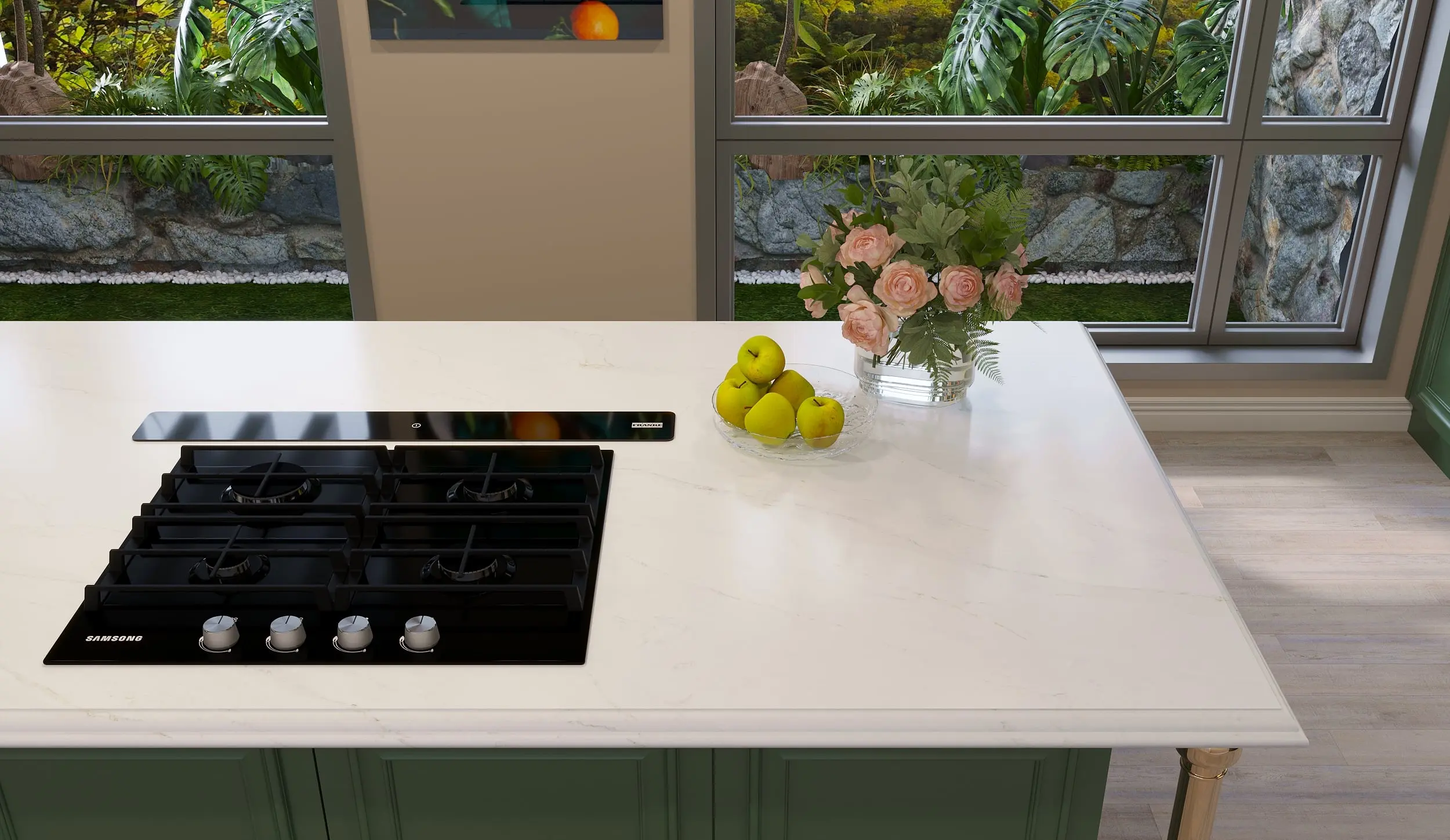 Inara is a premium engineered stone inspired by the timeless elegance of natural Calacatta marble. Its bright white surface is enriched with a combination of bold and fine grey veining, accented by subtle warm tones that add depth and character.