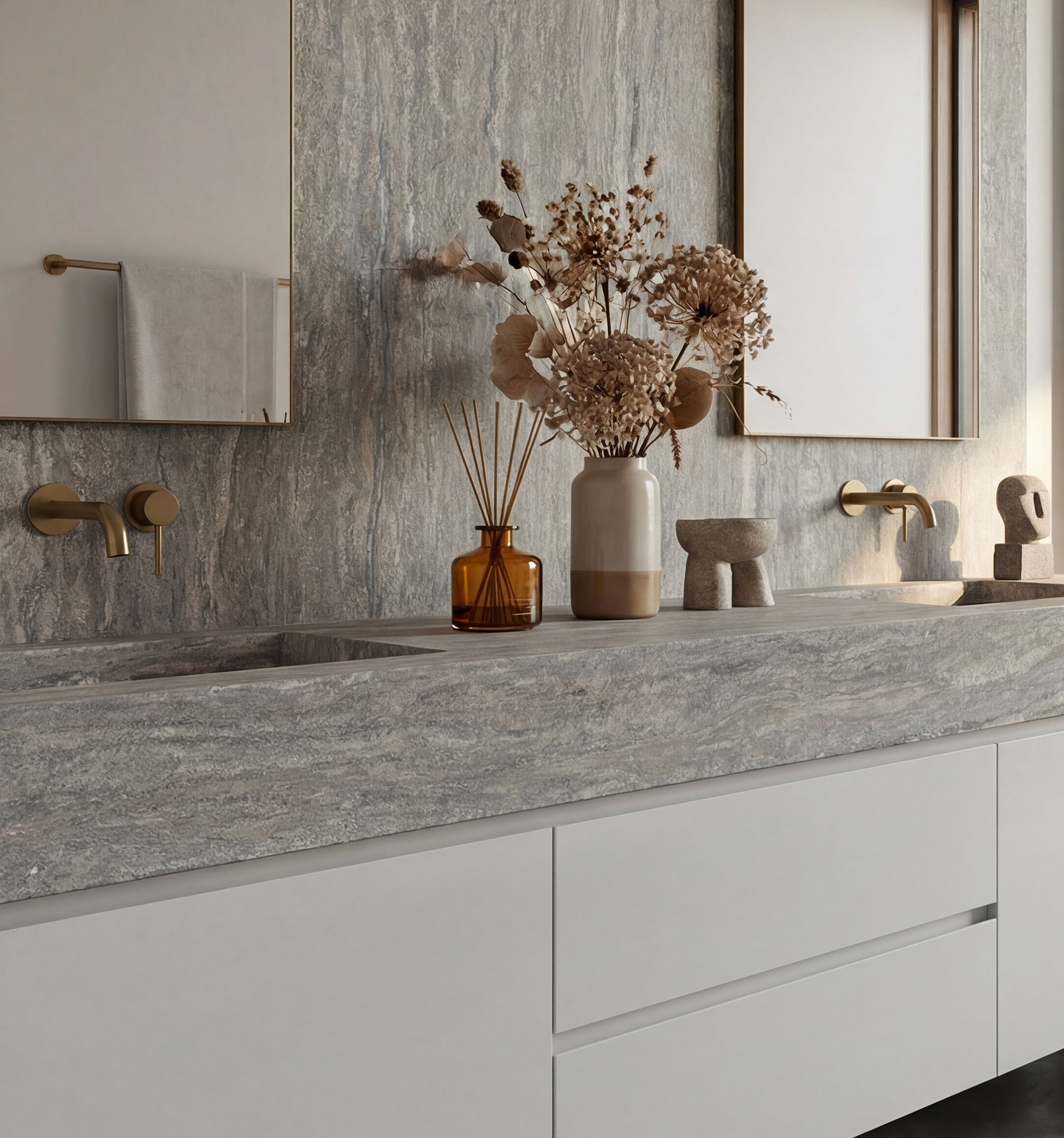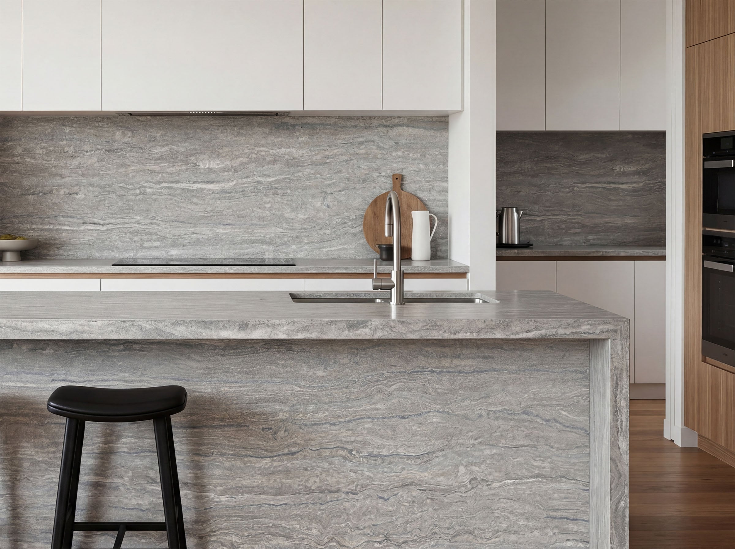 Linea Oceano brings a soft, architectural elegance through its travertine-inspired movement and refined honed finish. Inspired by Silver Travertine, the surface features gentle linear texture and natural flowing detail, creating a calm yet sophisticated look suitable for both residential and commercial interiors. Its balanced neutral palette pairs beautifully with timber cabinetry, brushed metals, warm whites, soft greys, and contemporary minimalist finishes. Suitable for kitchen benchtops, waterfall islands, splashbacks, bathroom vanities, and feature applications, Linea Oceano delivers a timeless stone-inspired look with a clean and modern character.