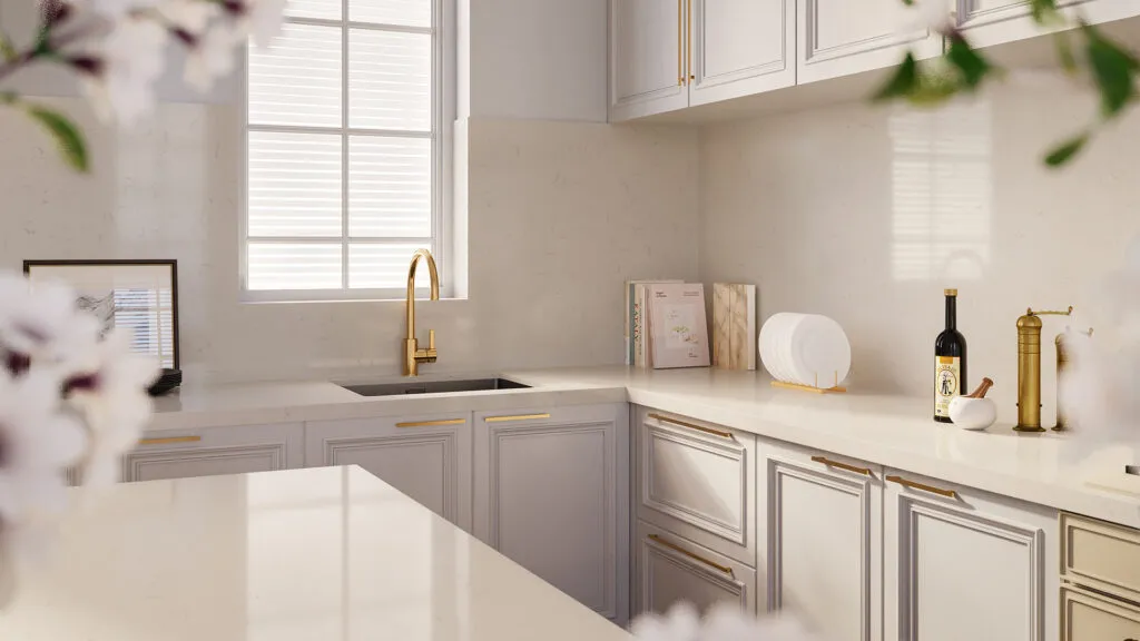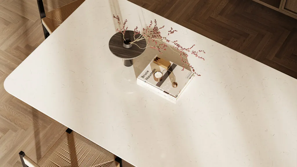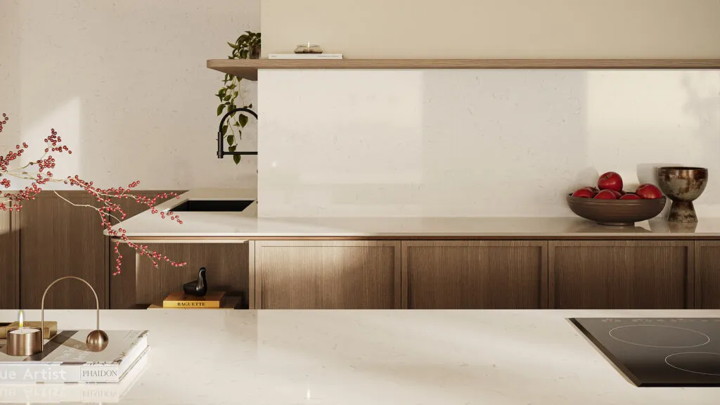 Warm white ICON™ surface with fine grey veining—ideal for refined kitchens and interiors.