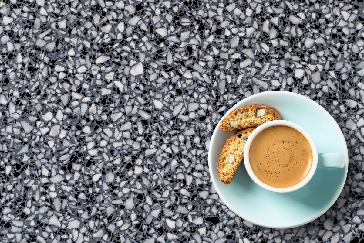 Honed terrazzo surface with a cool, contemporary look, ideal for indoor and outdoor spaces.