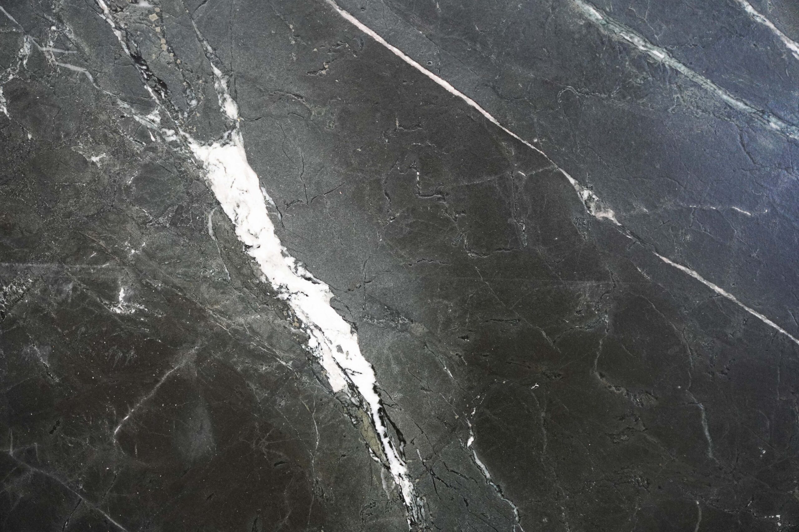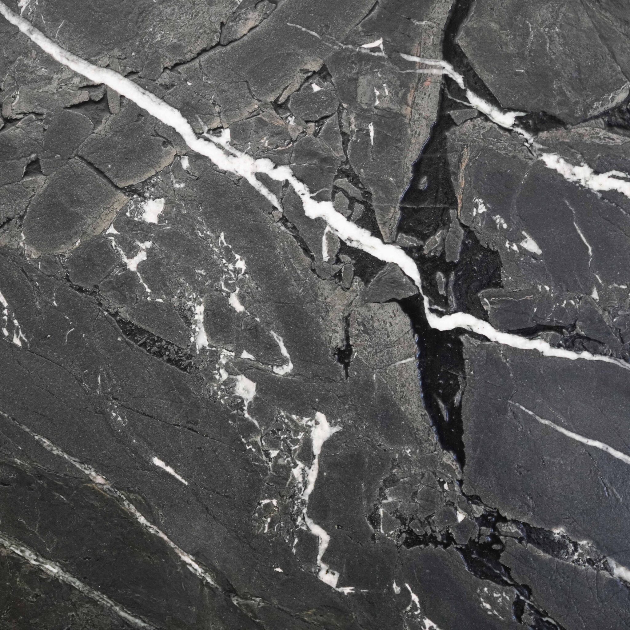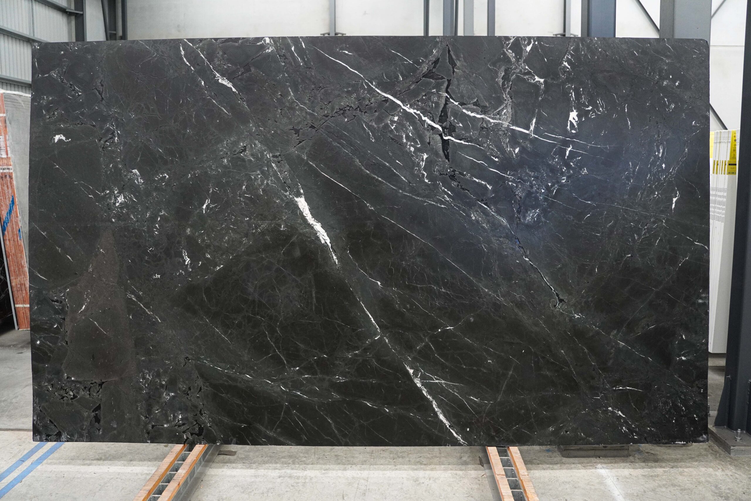 Black Quartzite with flowing white veining and bold movement, ideal for kitchen benchtops and dramatic interiors.