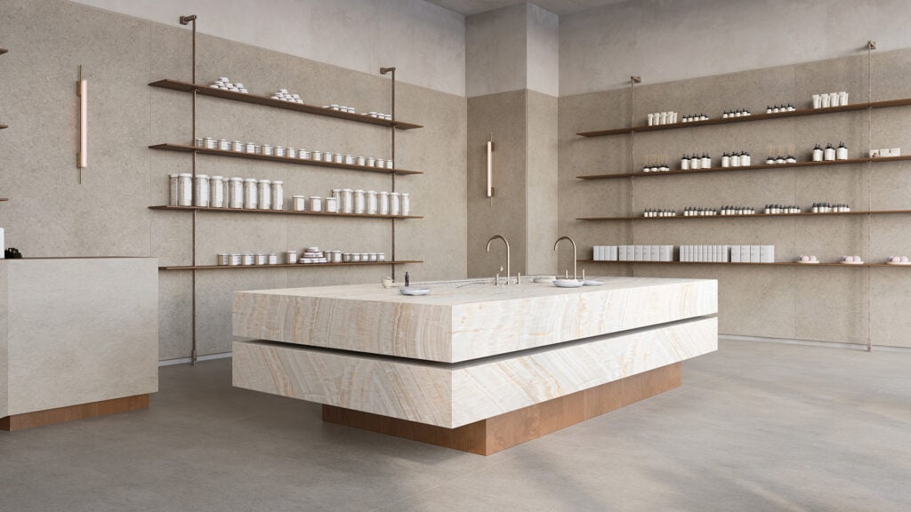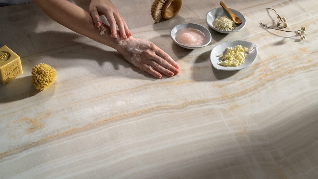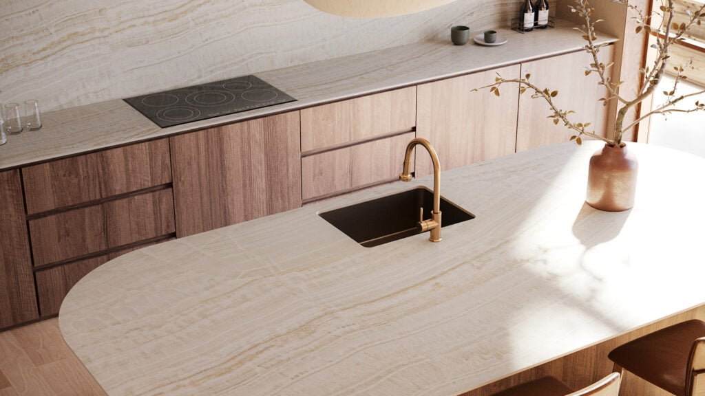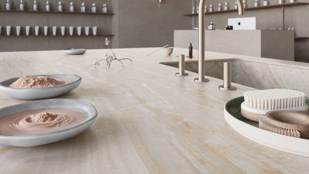 509 Onyxa is a warm porcelain surface inspired by natural onyx, featuring flowing layers of warm white, translucent beige, gold, rust, and taupe. Its honed finish and luster effect create a soft, elegant surface ideal for kitchens, bathrooms, outdoor kitchens, benchtops, splashbacks, and feature areas.
