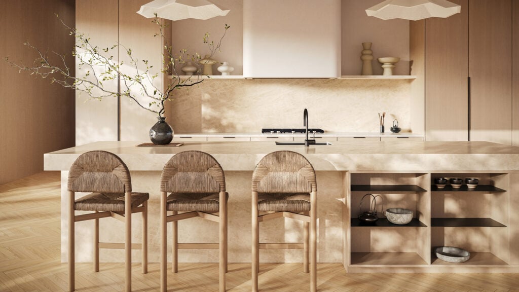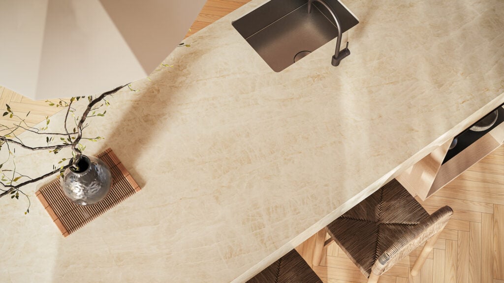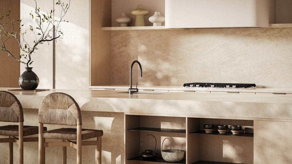 584 Opal Taj brings together soft taupe, beige, brown, and creamy-white veining to create a warm, earthy surface with refined natural movement. Its honed finish gives the design a smooth, velvety appearance, while the subtle luster effect adds depth and gentle texture through the veining. The balanced neutral palette makes it easy to pair with timber cabinetry, brushed metals, warm whites, soft beige tones, and contemporary interiors. Suitable for indoor and outdoor applications, 584 Opal Taj is a sophisticated option for kitchen benchtops, bathroom vanities, outdoor kitchens, splashbacks, and feature walls where a calm, luxurious, and organic look is desired.