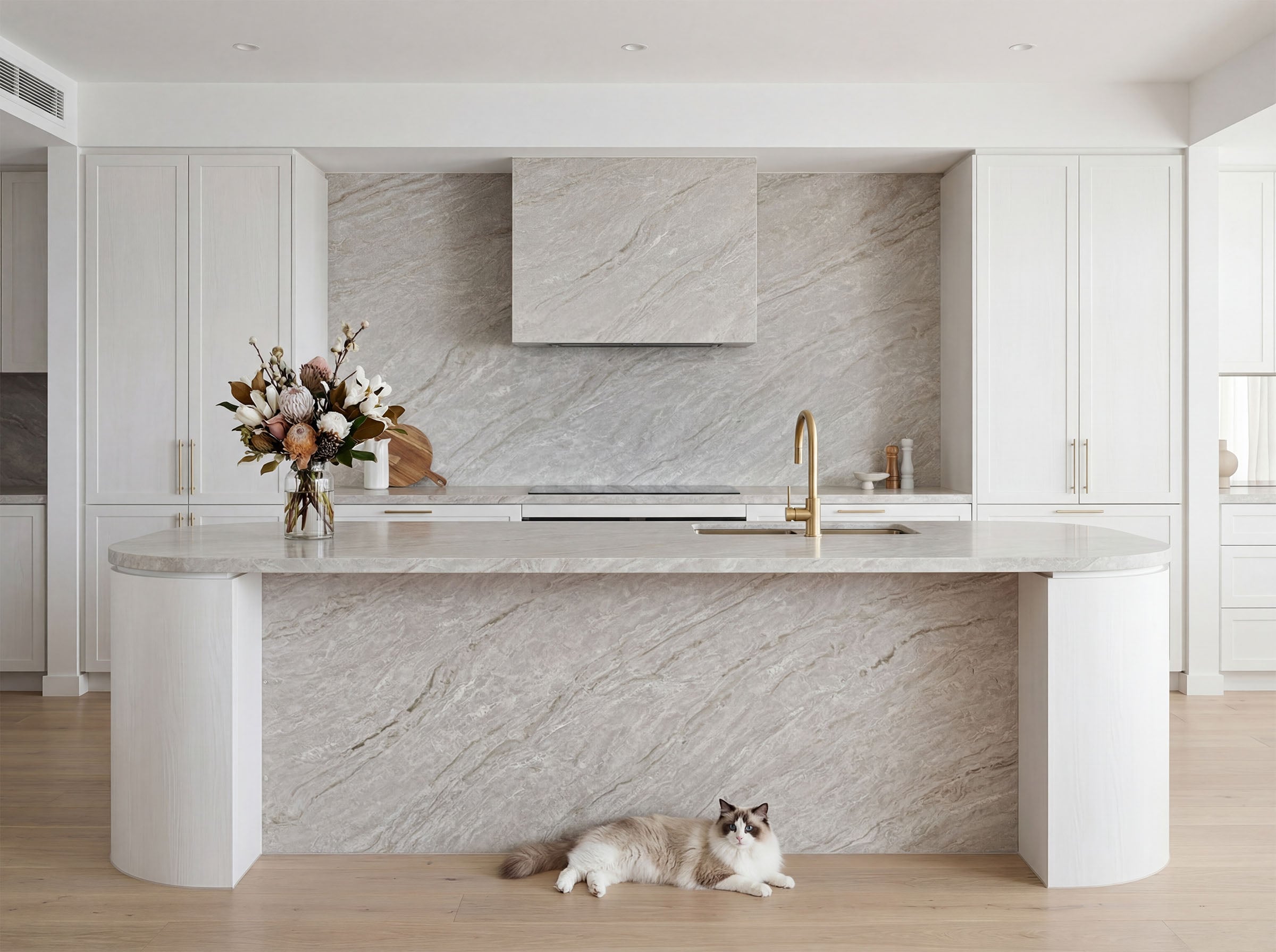 Royal Taj brings warmth, softness, and natural elegance through its creamy base and graceful brown veining. Inspired by Taj Mahal Quartzite, this surface offers a calm yet luxurious look that works beautifully in both modern and classic interiors. The flowing movement across the slab adds depth and visual interest without feeling too busy, making it ideal for spaces that need a refined natural stone look with a warm neutral palette. Royal Taj pairs especially well with timber cabinetry, brushed brass, warm whites, beige tones, and soft contemporary finishes. Suitable for kitchen benchtops, waterfall islands, splashbacks, bathroom vanities, and statement feature areas, Royal Taj creates a sophisticated and timeless finish.