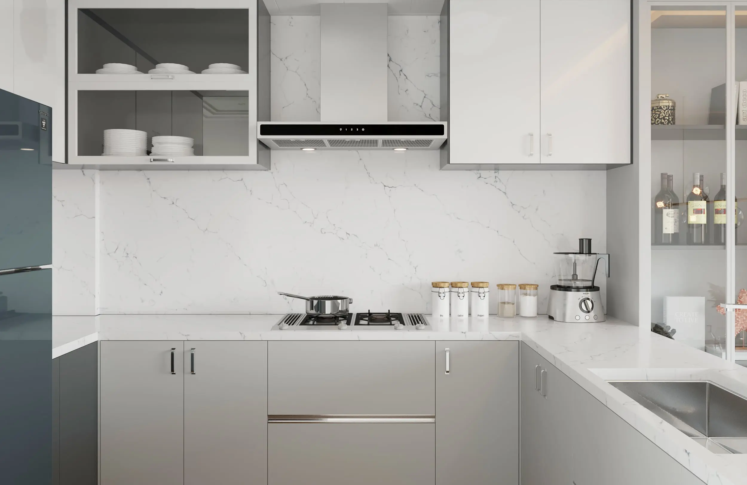 Add splashbacks, benchtops, island using shapes.