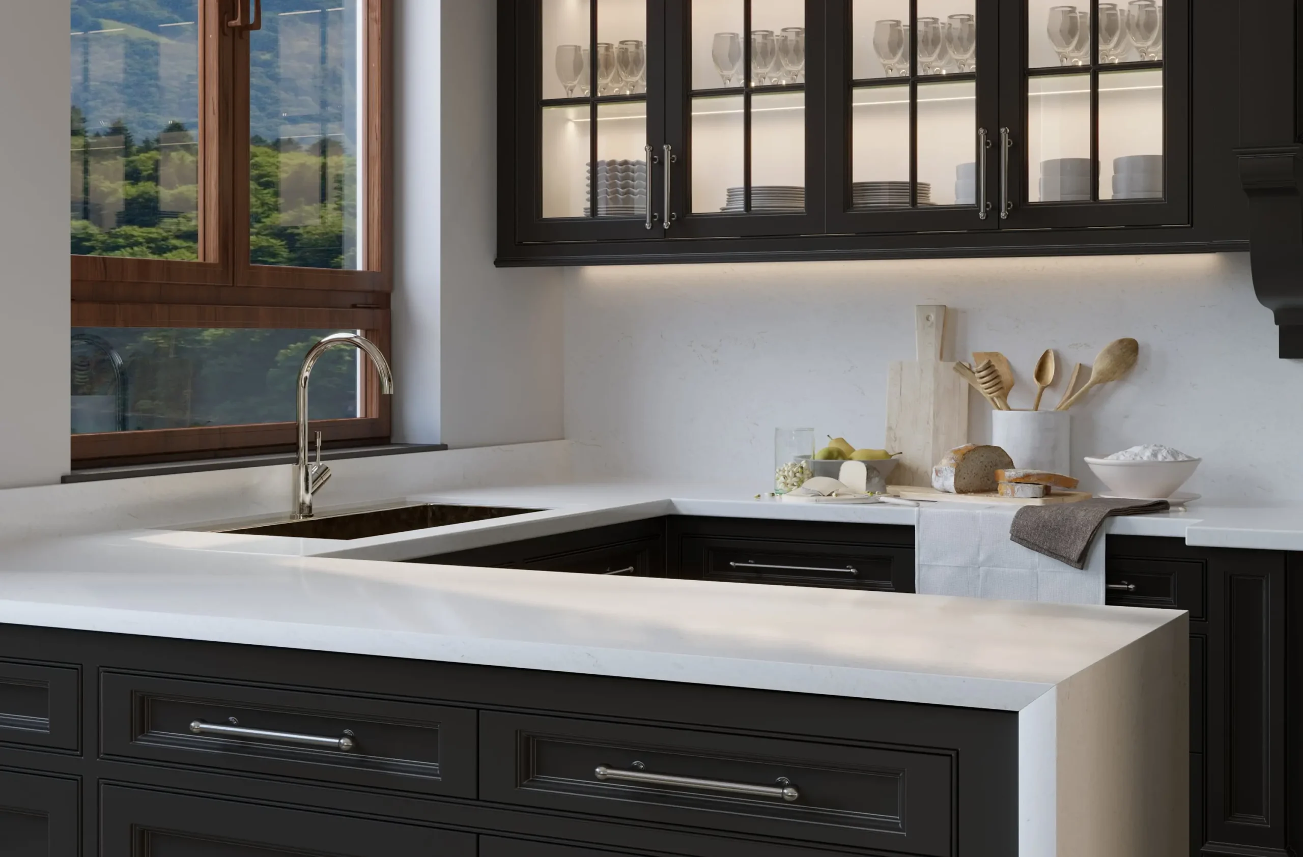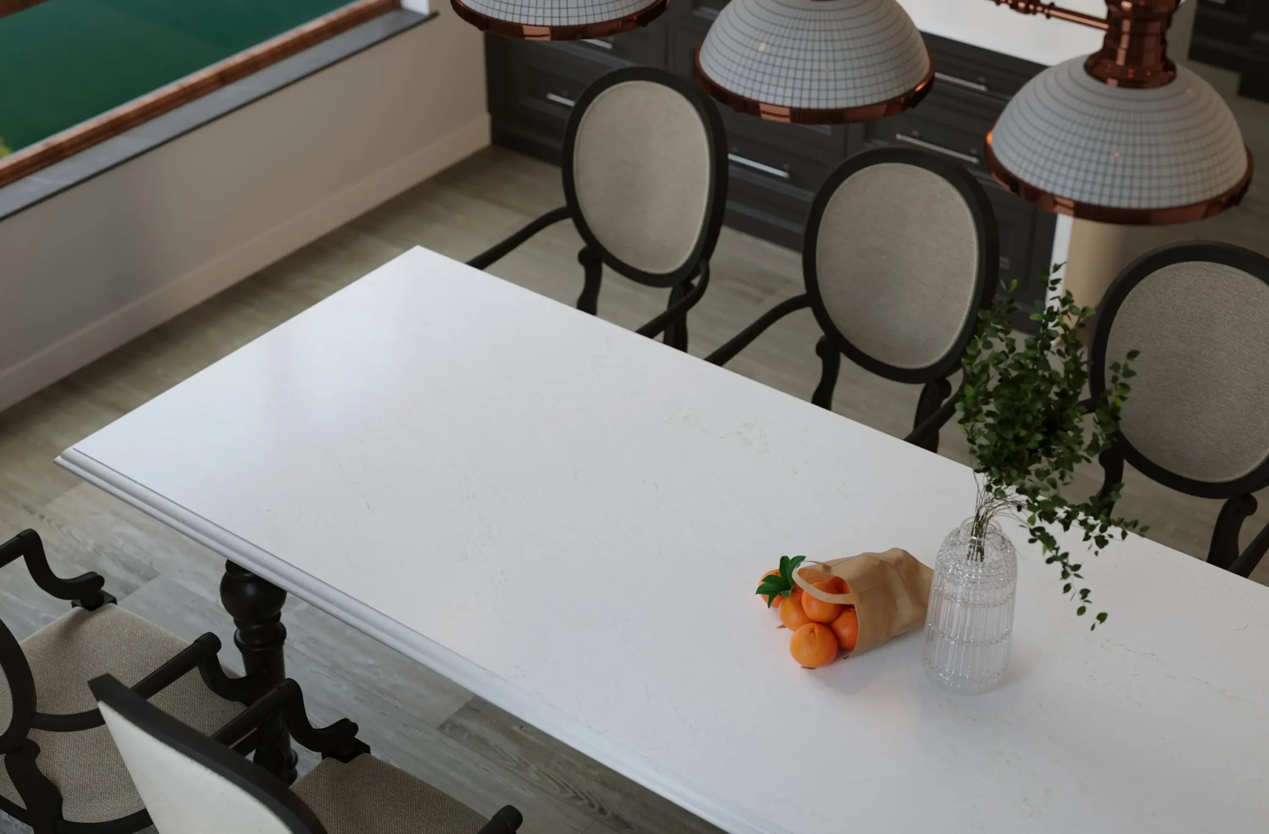 The subtle pattern creates a sense of natural depth without strong contrast, making it ideal for kitchen benchtops, waterfall islands, splashbacks, bathroom vanities, and feature walls. It pairs beautifully with timber finishes, neutral cabinetry, and soft contemporary palettes.